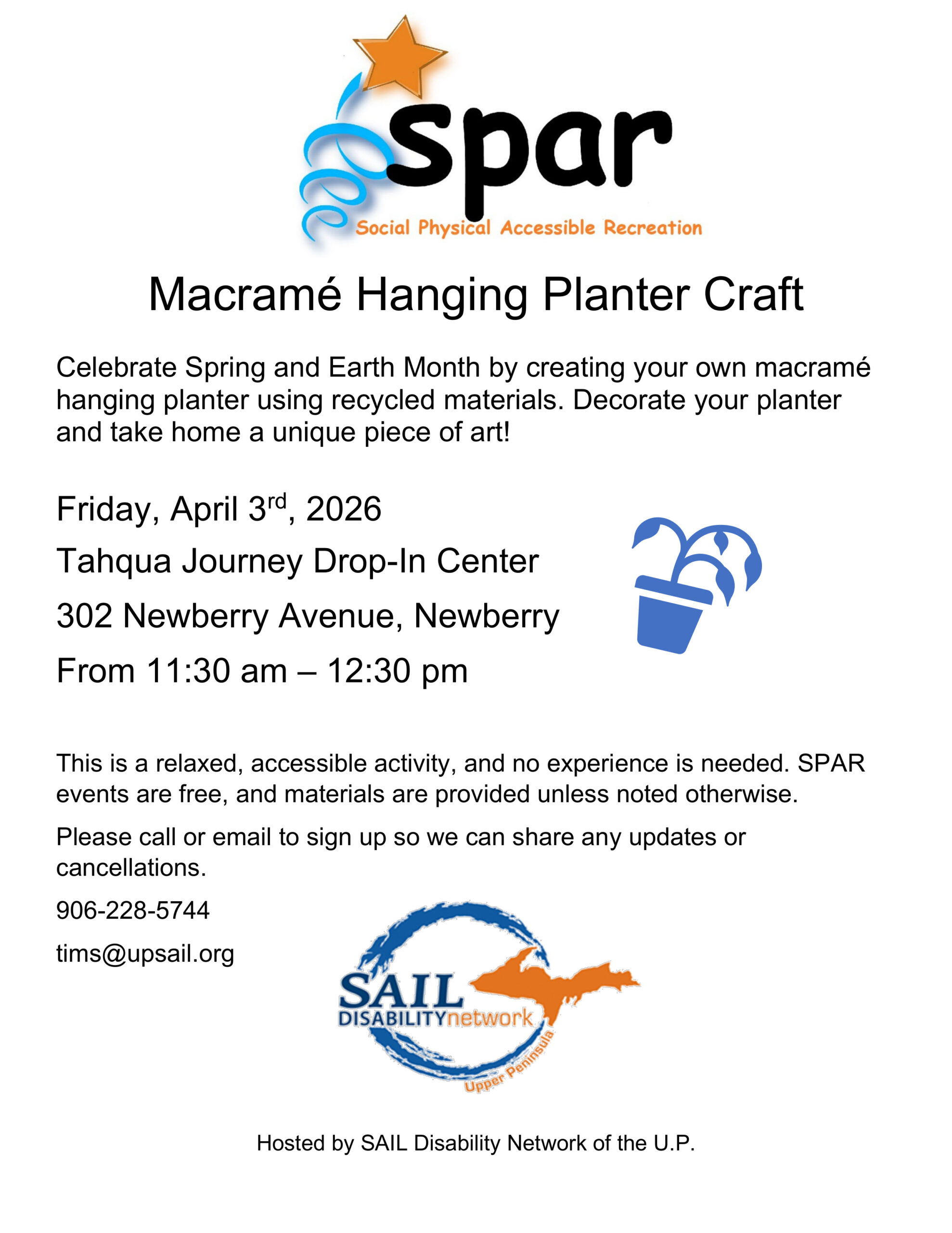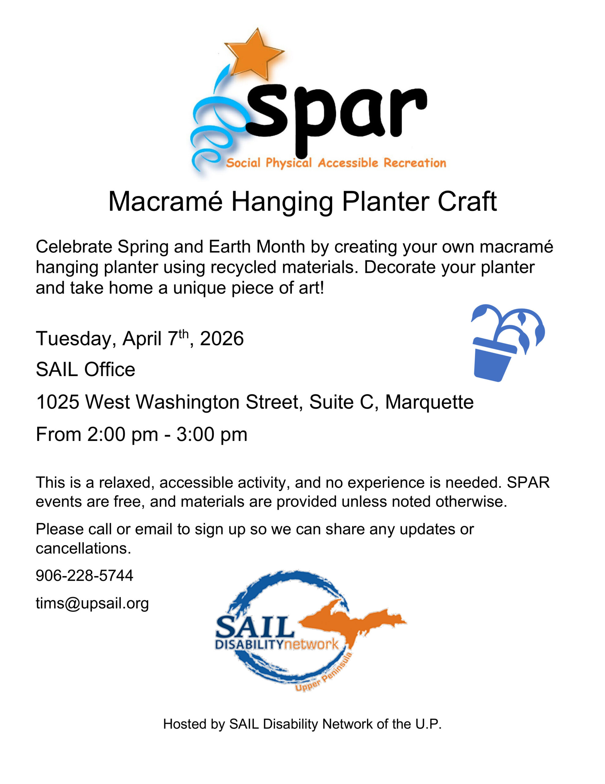 SAIL Office 1025 West Washington Street Suite C, Marquette, MI, United StatesImage description begins. The text on the SPAR flyer reads. Macramé Hanging Planter Craft. Celebrate Spring and Earth Month by creating your own macramé hanging planter using recycled materials. Decorate…