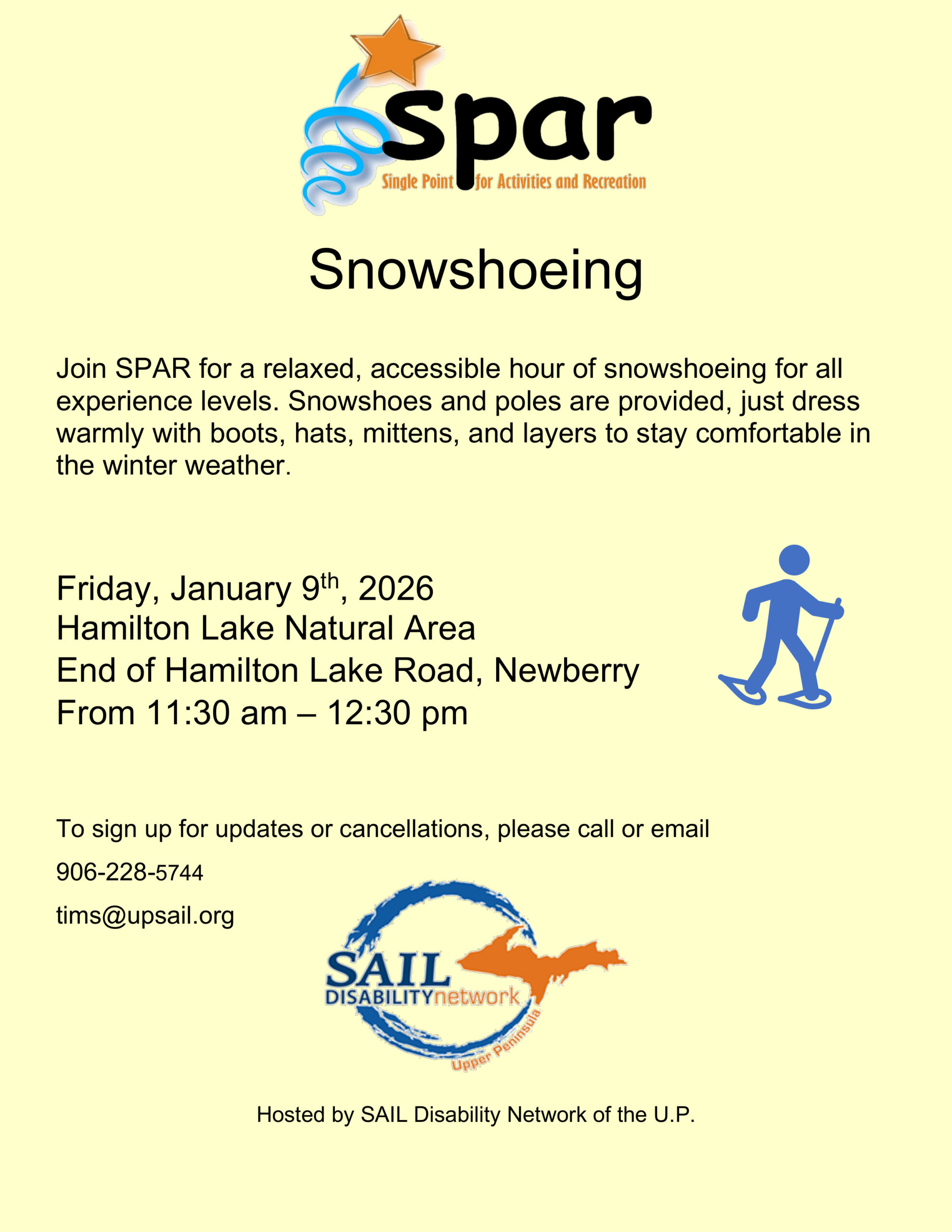 Image description begins. The text on the flyer reads. 2026 SPAR Marquette Snowshoe Club. Join SPAR for a relaxed, accessible hour of snowshoeing for all experience levels. Snowshoes and poles…